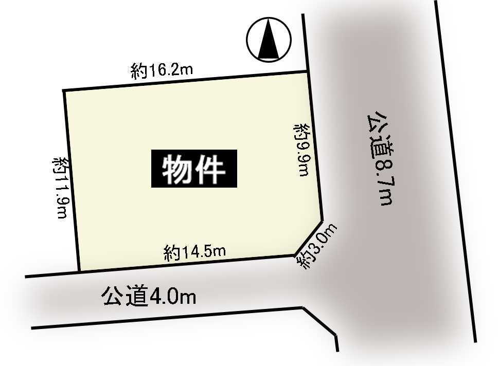 | 接道状況 | 角地 (東側 公道8.7m 間口9.9m) (南側 公道4.0m 間口14.5m) | ||